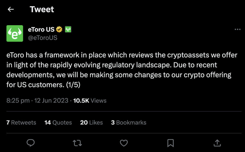 U twitter objavi od 12. juna 2023. godine, eToro US je primijetio da je pregledao svoje kriptovalute “u svjetlu brzo razvijenih propisa” i “nedavnih događaja” sa SEC-om.