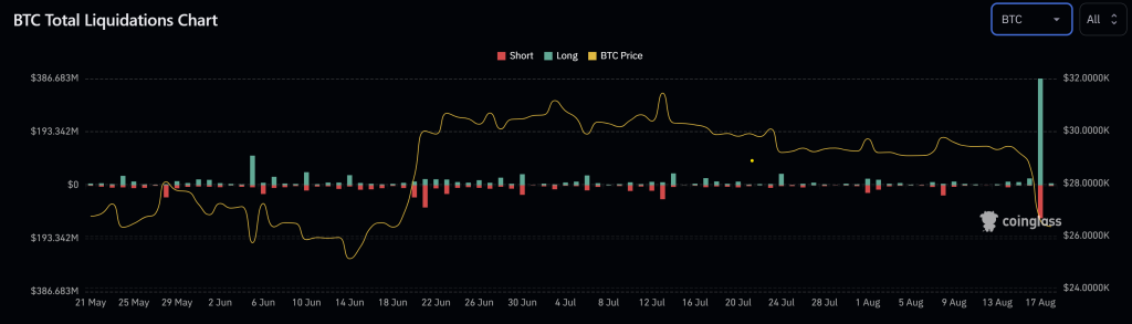 Uprkos medijskom ludilu oko prodaje bitkoina kompanije SpaceX, čini se da je stvarni podsticaj za pad cijena ukorijenjen u fjučers tržištu. Tržište je svjedočilo najvećoj kaskadi likvidacije fjučersa od uspona FTX-a, pri čemu su duge likvidacije BTC-a prikupile zapanjujućih 386,68 miliona dolara, na osnovu podataka Coinglass-a.