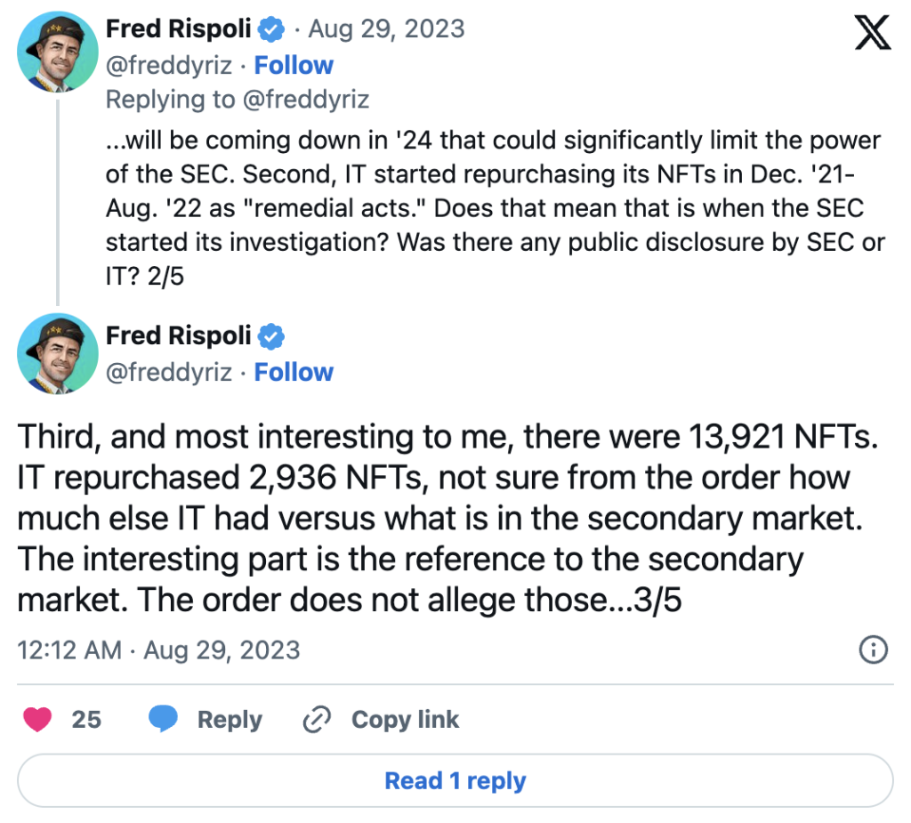 Dva komesara SEC-a nisu se složila s odlukom SEC-a da preduzme mjere protiv NFT-a iz teorije uticaja, tvrdeći da provedbena radnja SEC-a otvara mnoga teška pitanja.