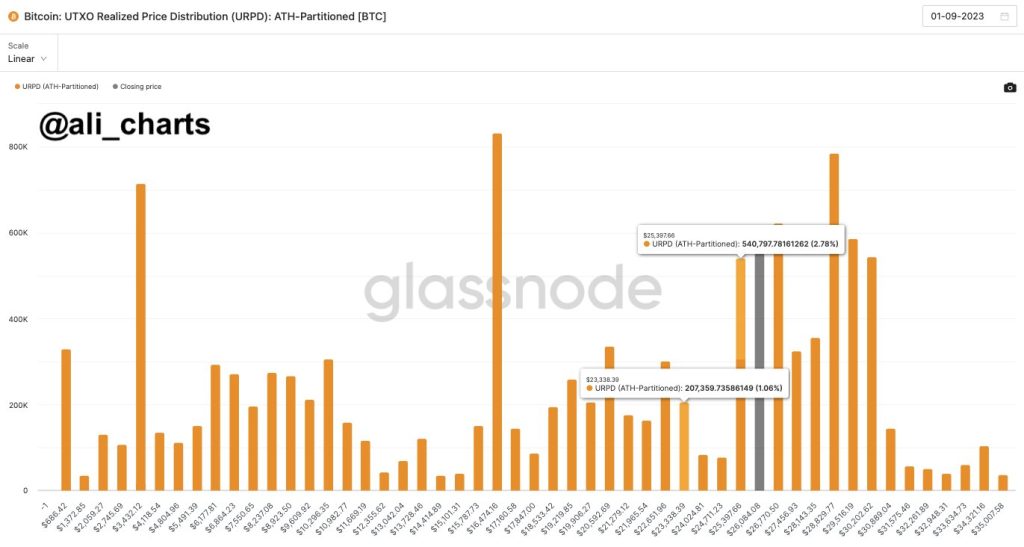 „Podaci na lancu ukazuju na to da $BTC nema snažnu podršku ispod granice od 25.400 dolara“, rekao je popularni trgovac Ali pretplatnicima X (bivši Twitter).
