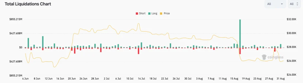 Podaci iz CoinGlass-a u međuvremenu su pokazali da je 31. avgust izazvao najveći obim dugih likvidacija BTC-a od pada Bitcoin-a za 10% ranije ovog mjeseca.