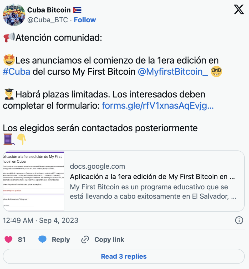 Dana 4. septembra, Bitcoin Cuba je objavio na društvenim mrežama da su otvorene prijave za prvo izdanje sopstvene verzije Mi Primer Bitcoin-a.