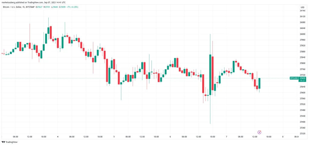 Podaci iz Cointelegraph Markets Pro i TradingView pokazali su da se cijena BTC-a kretala oko nivoa od 25.700 dolara.