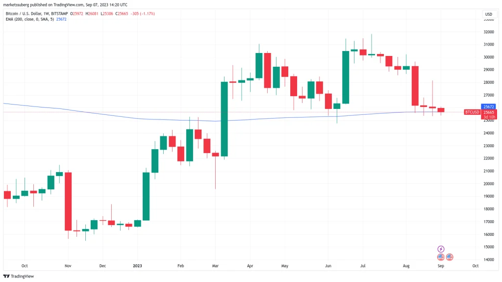 Michaël van de Poppe, osnivač i izvršni direktor trgovačke firme Eight, istakao je 200-nedeljni eksponencijalni pokretni prosek (EMA) na nivou od 25.670 dolara kao ključni nivo za praćenje na nedeljnim vremenskim okvirima.