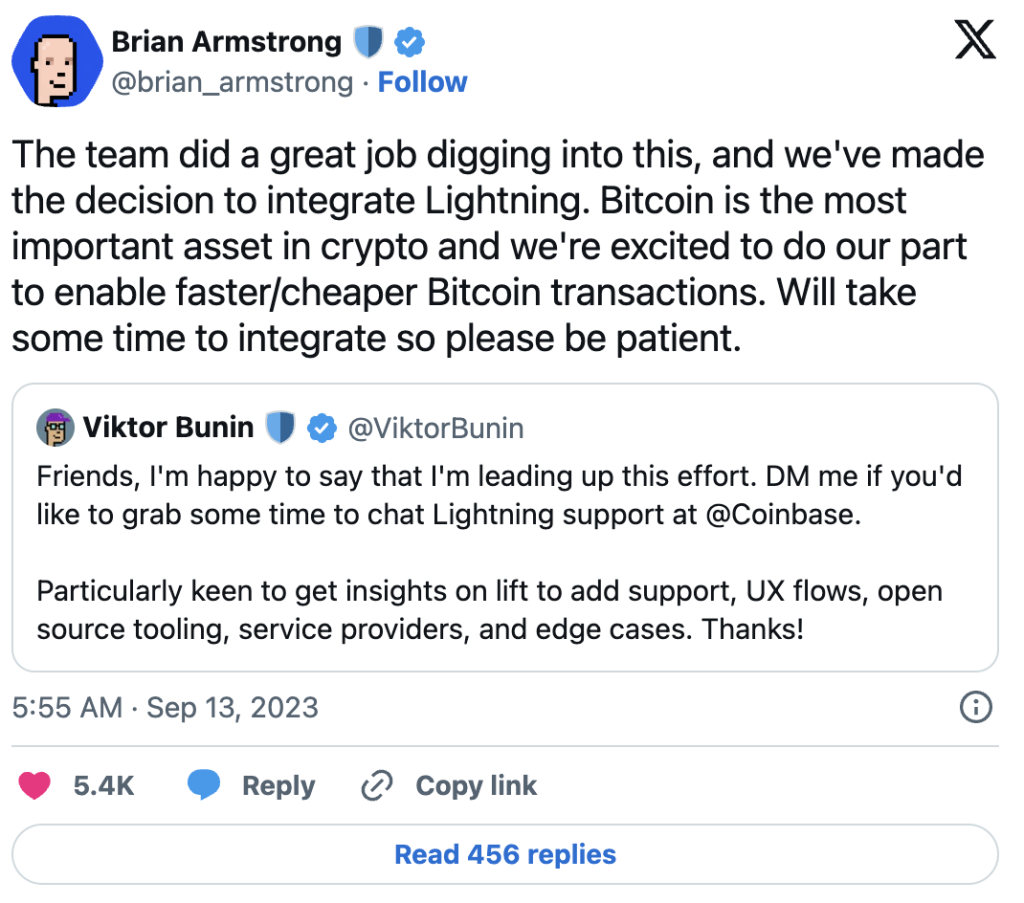 Odluka je donijeta mjesec dana nakon što je Viktor Bunin, stručnjak za protokol u Coinbase-u, počeo istraživati izvodljivost integracije LN-a. Tokom tog perioda, osnivač MicroStrategy, Michael Saylor, i CEO kompanije Square, Jack Dorsey, javno su doveli u pitanje Armstrongovu poziciju u vezi sa LN-om.