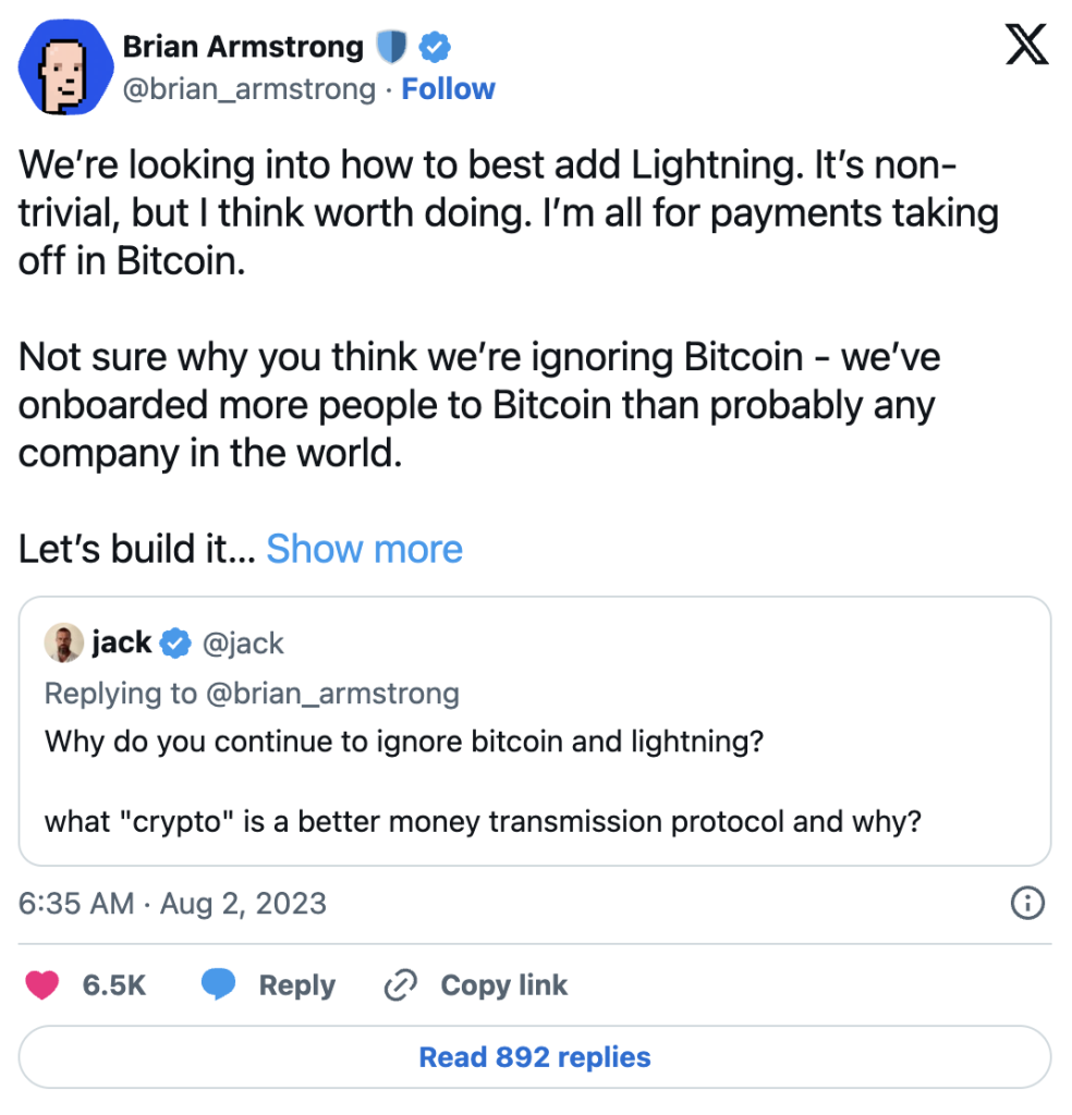 Suprotstavljajući se prevladavajućem narativu, CEO Coinbase-a, Brian Armstrong, potvrdio je odluku berze da integriše Lightning Network. Dodao je: