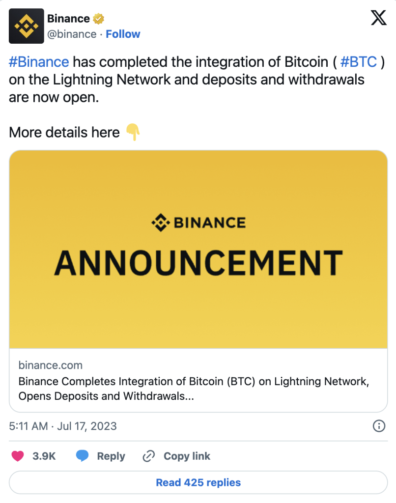 17. jula, Binance je najavio završetak integracije Bitcoin LN-a za povlačenje i uplate BTC-a.