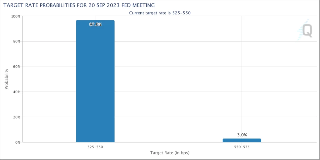 Ovaj trend osnovne inflacije poklapa se sa povećanjem procena trgovaca na derivatnim tržištima o obustavi povećanja kamatnih stopa u septembru. Treba napomenuti da su vjerovatnoće ciljne stope za sastanak Fed-a zakazan za 19-20. septembar porasle sa 93% pre nedelju dana na 97%.