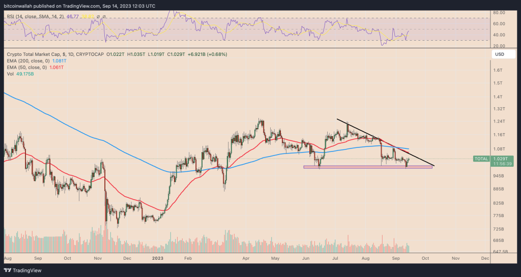 Pored toga, višemjesečna silazna trend-linija otpora kripto tržišta ograničila je njegove mogućnosti rasta od jula 2023. godine. Dakle, trenutni oporavak može da se nastavi dok tržišna kapitalizacija ne dostigne trend-liniju ili svoj 50-dnevni EMA, koji se nalazi na 1.040 biliona dolara.