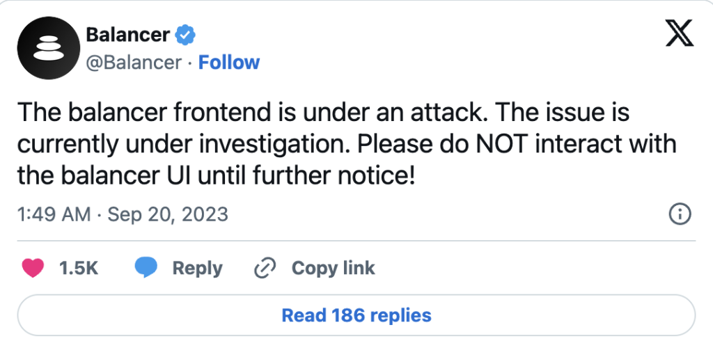 Platforma je obavijestila svoju zajednicu 19. septembra u 23:49 UTC, pozivajući korisnike da ne komuniciraju sa Balancer protokolom do daljnjeg.