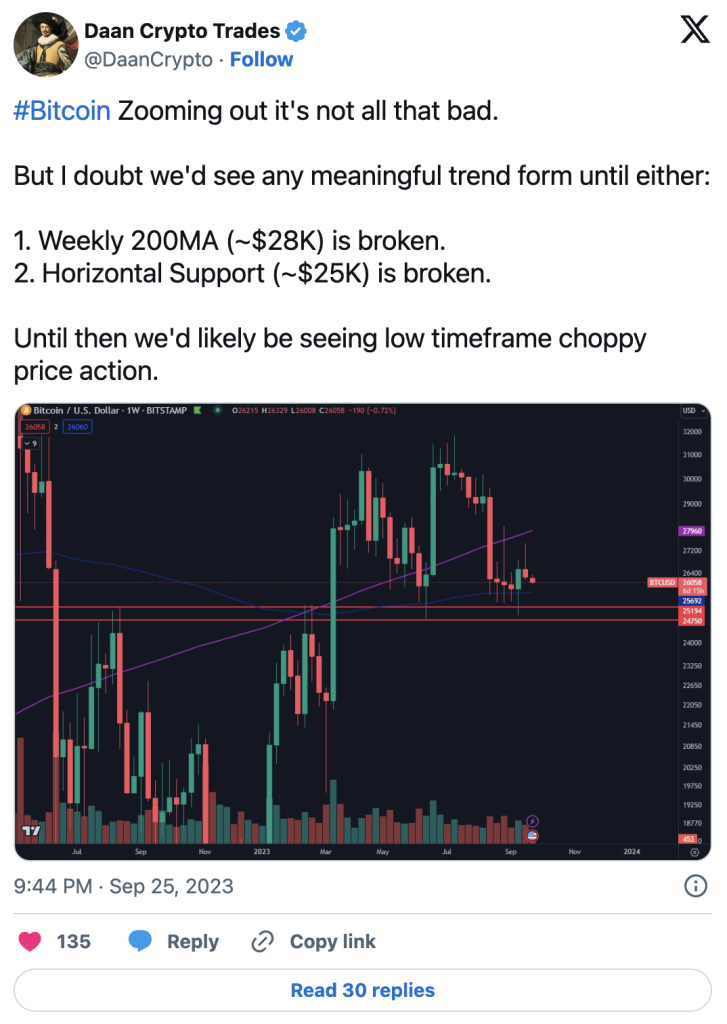 “Do tada ćemo vjerovatno vidjeti nestabilnu cijenu u niskom vremenskom okviru,” predvidio je pretplatnicima X (bivši Twitter) 26. septembra.