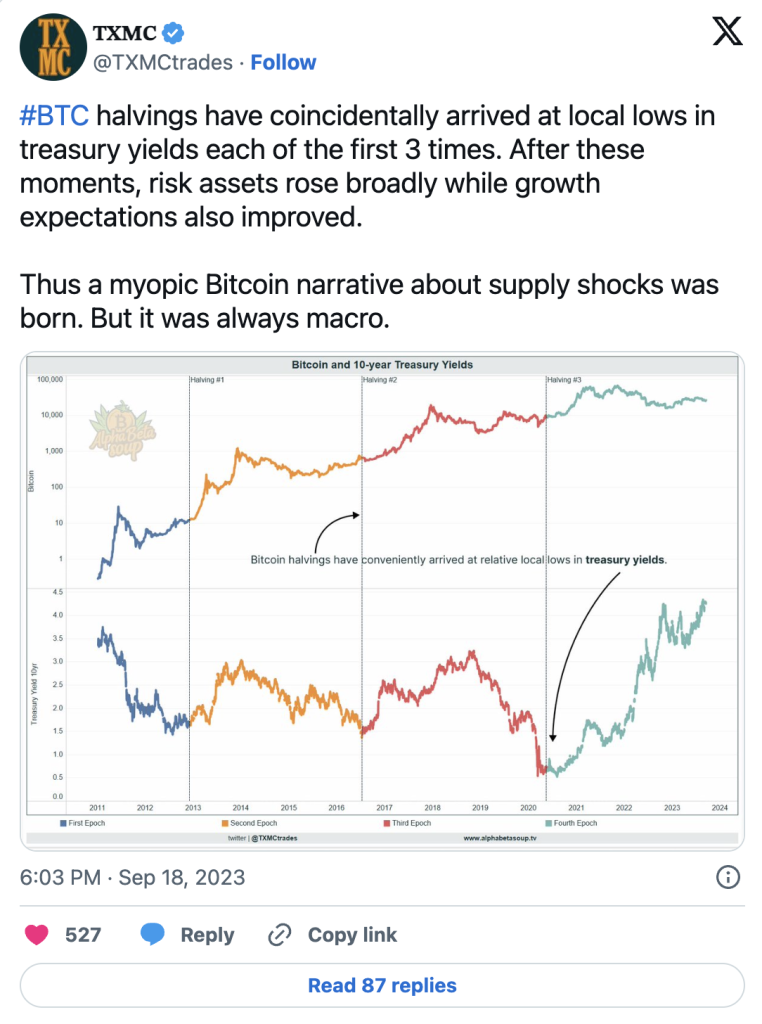 Zanimljiv grafikon koji TXMC dijeli na X (ranije poznat kao Twitter) navodi argument da se prepolovljenje bitkoina poklopilo sa “relativnim lokalnim niskim vrijednostima” u 10-godišnjem prinosu trezora. Uprkos upitnoj upotrebi termina „relativan“, koji se ne poklapa precizno sa najnižim tromesečnim nivoom, ipak je vredno ispitati makroekonomske trendove koji okružuju prošla prepolovljenja.