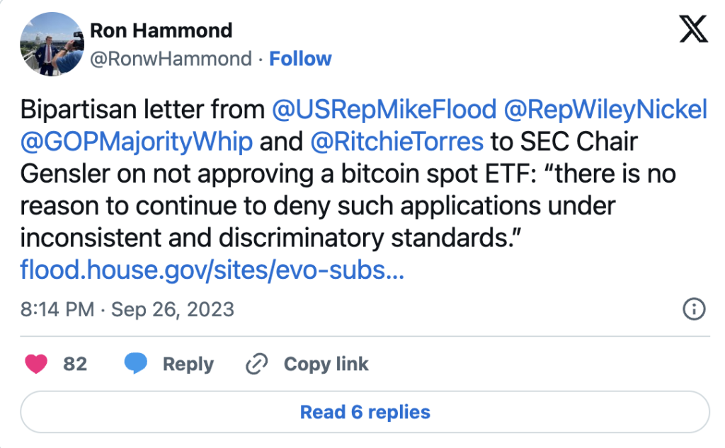 U pismu Gensleru od 26. septembra, američki predstavnici Mike Flood, Wiley Nickel, Tom Emmer i Ritchie Torres tvrdili su da SEC “diskriminirše proizvode kojima se trguje na berzi bitkoina”, navodeći pravni presedan koji je postavila Grayscale Investments u osvajanju pregled sopstvene ETF ponude. Četiri zakonodavca su rekla Gensleru da “nema razloga da se nastavi odbijati” spot kripto ETF aplikacije nakon odluke suda Grayscale, koja je zaključila da je obrazloženje SEC-a bilo “proizvoljno i hirovito” jer je već odobrena investicijska sredstva vezana za Bitcoin fjučerse.
