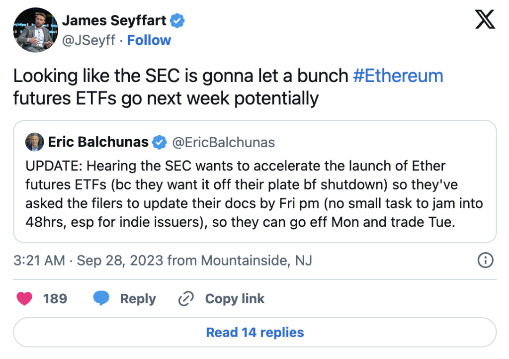 Dana 28. septembra, analitičar iz Bloomberga, James Seyffart, izjavio je u X postu da “izgleda da će SEC potencijalno dozvoliti da niz Ethereum futures ETF-ova krene sljedeće nedelje”.