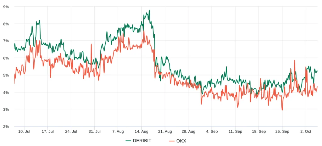 Mjesečni futures ugovori za Bitkoin obično se trguju sa blagim premijumom u odnosu na spot tržišta, što ukazuje da prodavci traže više novca kako bi odložili poravnanje. Zbog toga bi BTC futures ugovori trebalo da se trguju sa 5% – 10% godišnjom premijom – situacija poznata kao kontango, što nije jedinstveno za kripto tržišta.