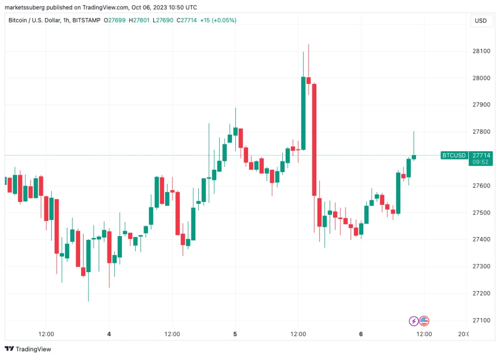 Podaci iz Cointelegraph Markets Pro i TradingView pokrivaju 24 sata za BTC/USD nakon neuspjelog ponovnog testiranja od 28.000 dolara.