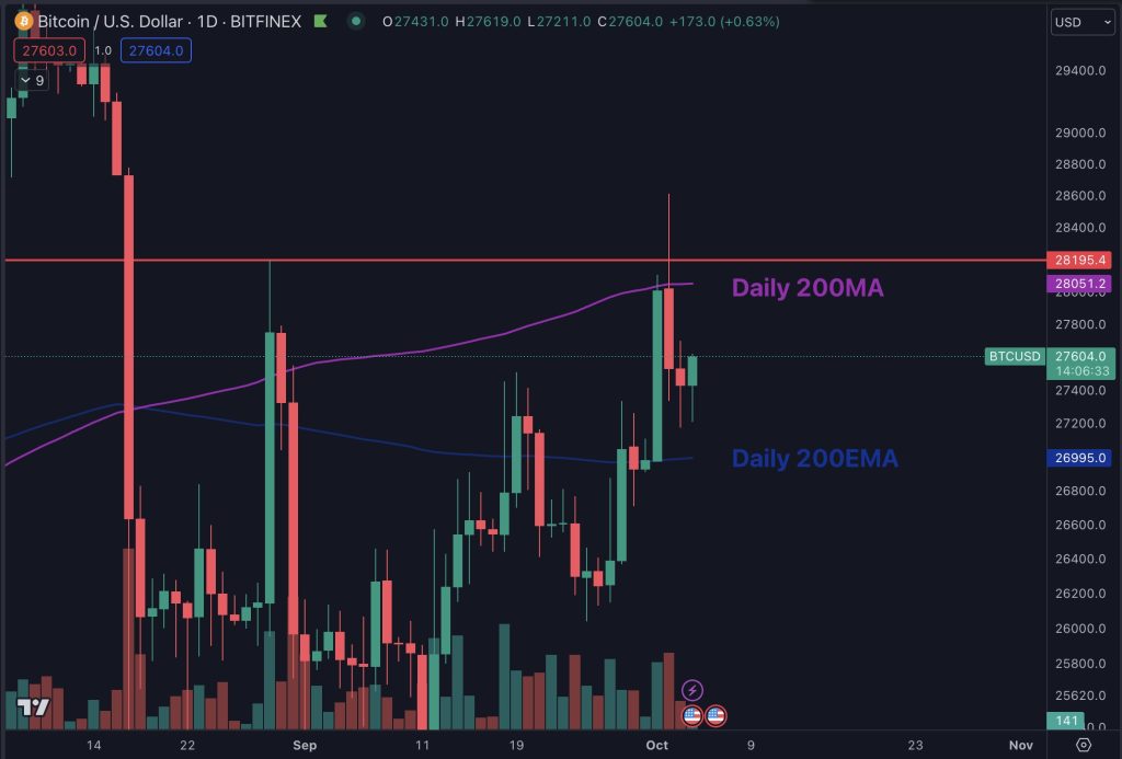 “Da li će Daily 200MA (ljubičasta) ili Daily 200EMA (plava) popustiti prvi, vjerovatno će odrediti trend do kraja oktobra ako sam morao nagađati,” napisao je uz grafikon u X postu 4. oktobra.