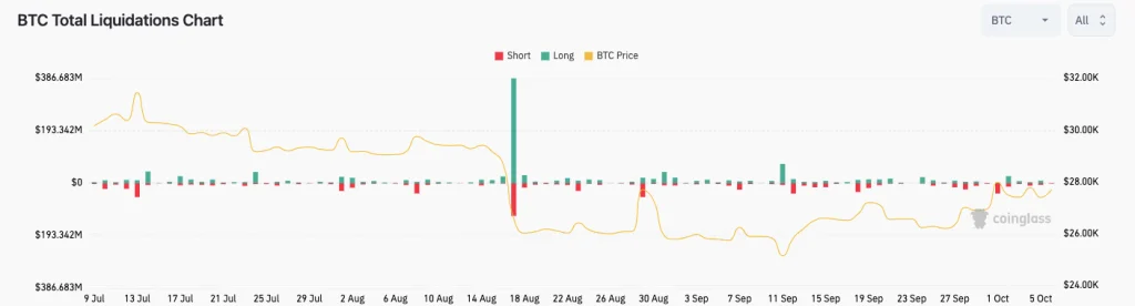 Podaci iz monitoring resursa CoinGlass pokazali su zanemarljive likvidacije na dugim i kratkim BTC pozicijama do 6. oktobra.
