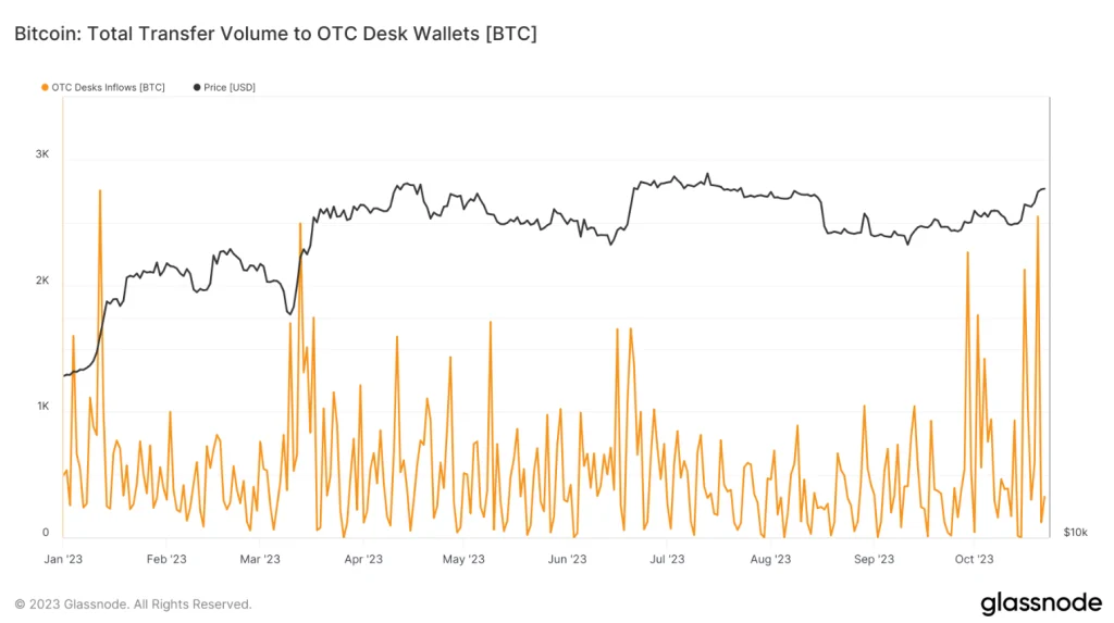 On je primjetio da podaci iz Glassnode pokazuju da su prilivi preko vanberzanskih (OTC) trgovinskih stolova naglo porasli od kraja septembra.