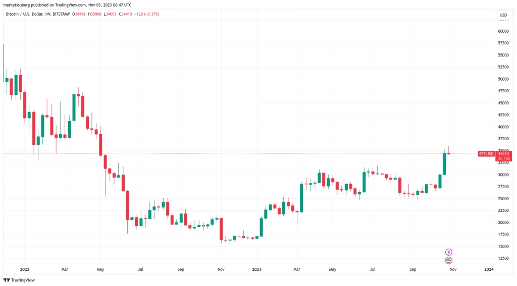 Trenutno, BTC/USD trguje oko 34.500 dolara, prema podacima iz Cointelegraph Markets Pro i TradingView-a, što znači da će za postizanje cilja na kraju godine biti potreban dodatni rast od 30%.