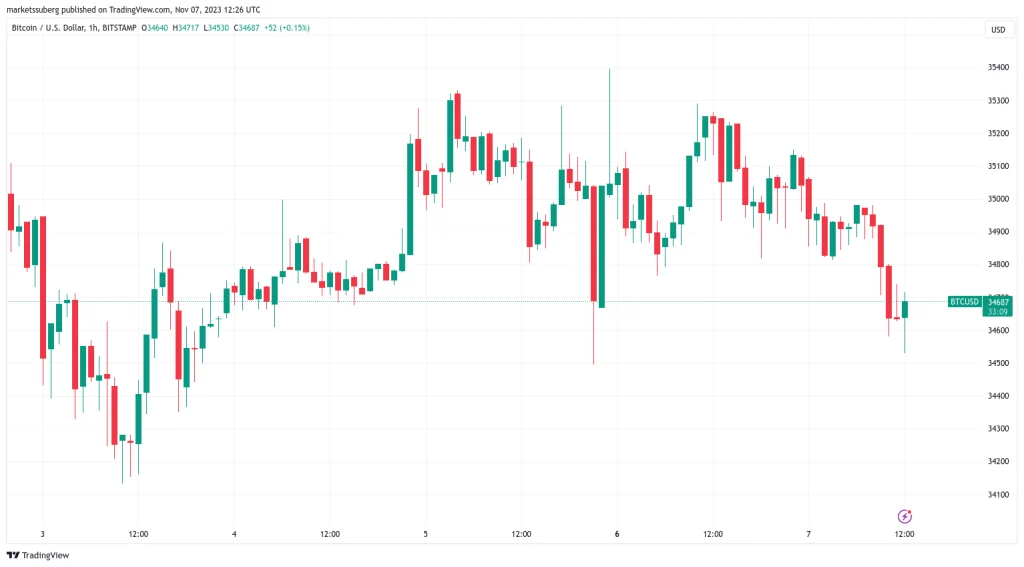 Bitcoin je pao prema 34.500 dolara 7. novembra kako su analitičari obratili pažnju na rastući interes.