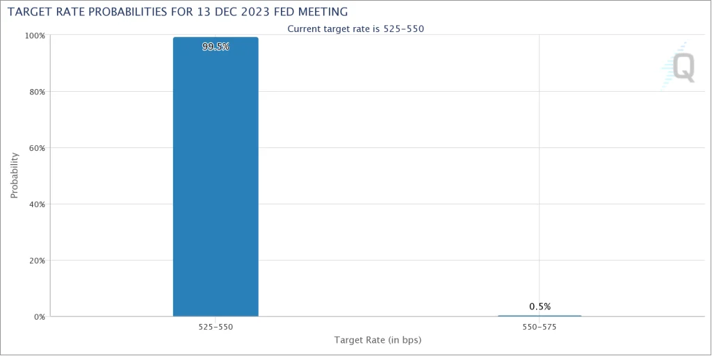 Podaci iz CME Group’s FedWatch Tool trenutno postavljaju šanse da Fed zadrži kamatne stope na trenutnim nivoima na gotovo jednoglasnih 99,5%.