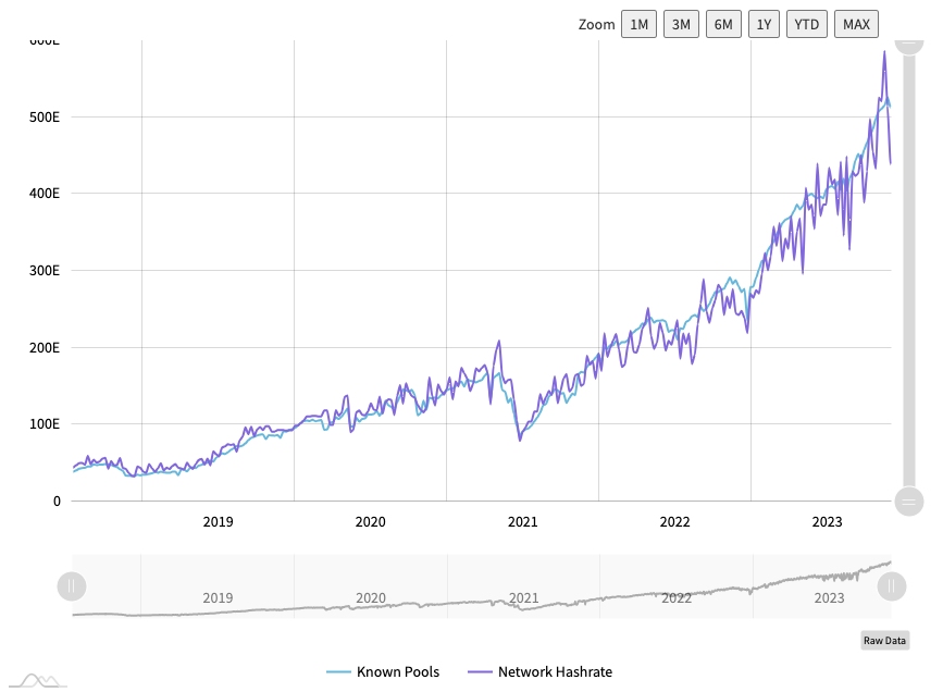 Hash rate – procjenjena mjera ove upotrebe – sada je na najvišim nivoima ikada, i ovog mjeseca je prvi put prešao 500 eksahasa u sekundi.