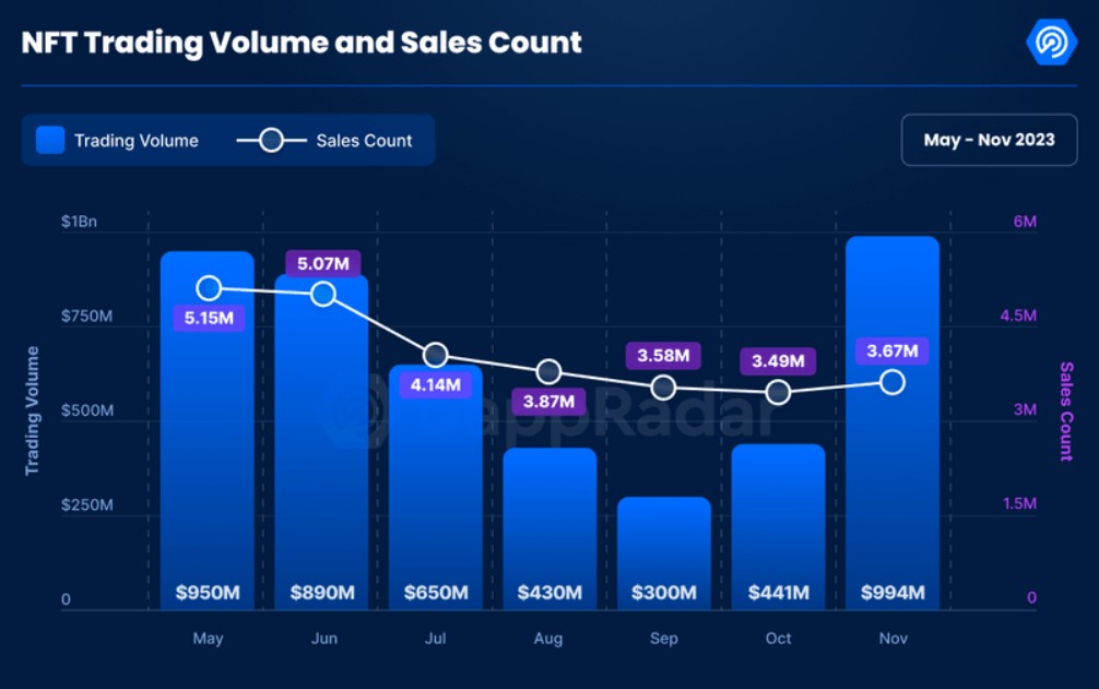 Kako se kripto tržišta okreću ka rastu, trgovina nezamjenjivim tokenima (NFT) počinje da se pridružuje toj talasu, sa obimom trgovanja koji se približava 1 milijardi dolara u novembru, prema podacima koje je objavila platforma za praćenje decentralizovanih aplikacija DappRadar.