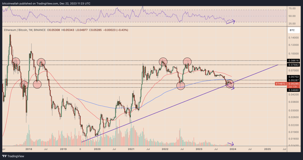 Štaviše, cijena se takođe kreće blizu podrške koja uključuje višegodišnju uzlaznu trend liniju i oblast 0,048–0,052 BTC.