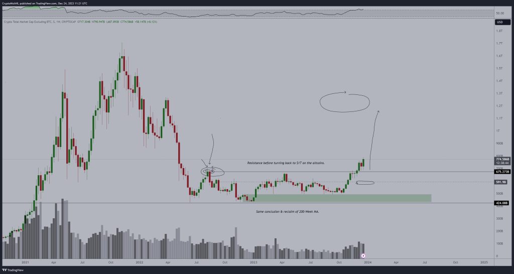 “Ukupna tržišna kapitalizacija za altcoine konačno izlazi iz opsega od 500+ dana”, rekao je X pretplatnicima na Badnje veče.