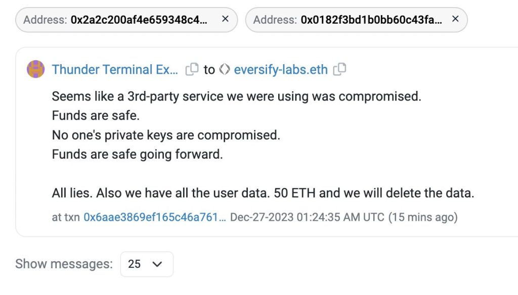 https://twitter.com/ThunderTerminal/status/1739843737860374845?ref_src=twsrc%5Etfw%7Ctwcamp%5Etweetembed%7Ctwterm%5E1739843737860374845%7Ctwgr%5E646327cfbe681cb886f51a85e3b4d5398a27b1e9%7Ctwcon%5Es1_c10&ref_url=https%3A%2F%2Fcointelegraph.com%2Fnews%2Fthunder-terminal-hack-exploit-wallet-compromise-hacker-demands-ransom